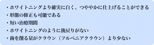 ホワイトニングを行う以上に確実に歯の色彩を自由にコントロールできることや矯正治療のように治療期間が長期にならないことが大きな魅力です。
