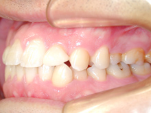 歯ぐきが歯周病とむし歯のために増殖し外側の歯の縁の上に盛り上がり覆いかぶさっています。 |