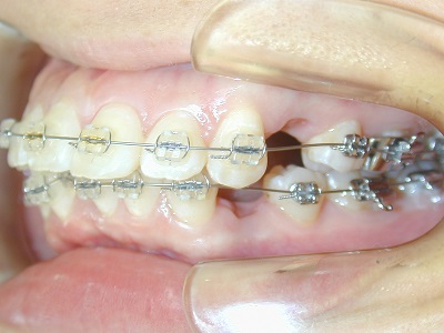 上下顎の第1小臼歯4歯を抜歯してクリアブラケットを犬歯から犬歯まで接着し、小臼歯にはメタルブラケット、第1大臼歯にはフック付きのダブルチューブ、第2大臼歯にはフック付きシングルチューブを接着しました。