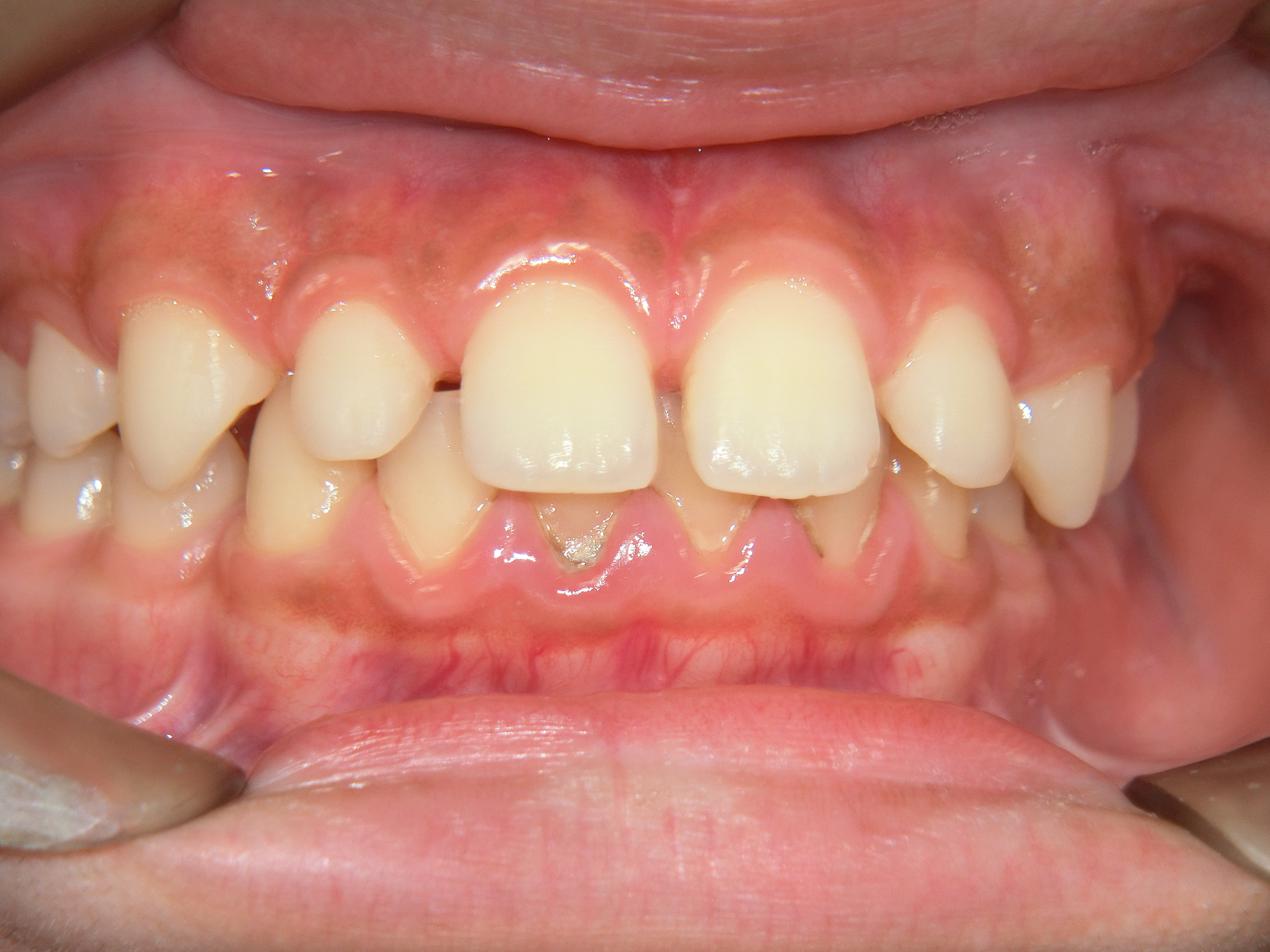 お口の中を拝見しますと過蓋咬合と前歯にすきまのある空隙歯列弓で上下顎前歯部に軽度の歯肉炎があり、下顎の前歯に歯石の付着がありました