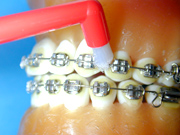 その後、最初のワイヤーを装着時(本格矯正の開始時)にブラッシング指導を行います。 ブラケットの中央部(スロット)にワイヤーが入っているので一歯につき、3方向から毛さきを入れ磨かなければなりません。 歯頚部側 (歯ぐきに近い方)から毛さきをワイヤーの裏側に入れて振動させて磨きます。 |